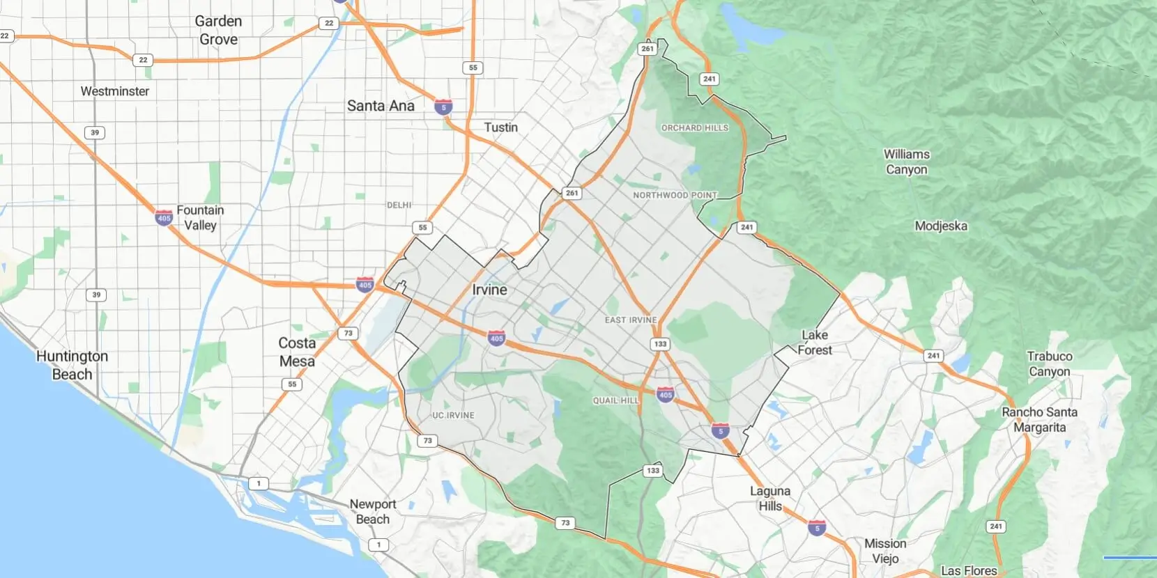 Our technicians head south on Red Hill Avenue, merge onto I-405 South, then transition to CA-133 South toward Irvine. We exit at Irvine Center Drive, which leads directly to the Irvine Spectrum Center and surrounding business campuses. Total drive time is approximately 20–25 minutes.