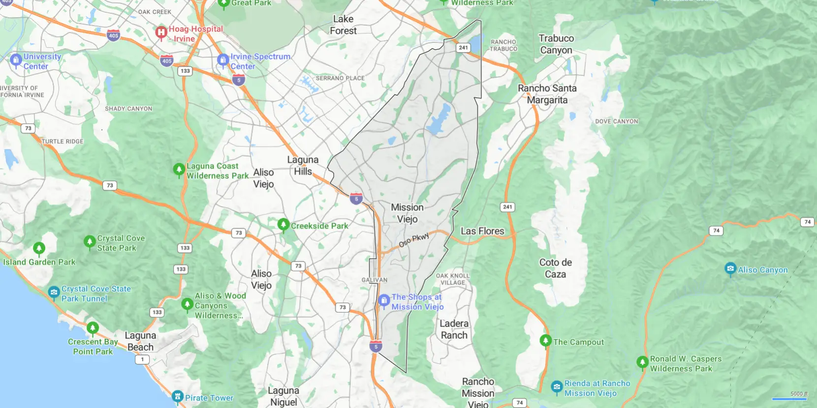 Our technicians head south on I-405, exit at Alicia Parkway, and continue east toward Mission Viejo. We turn onto Marguerite Parkway and follow signs toward Mission Viejo Lake. Total drive time is approximately 25–30 minutes.
